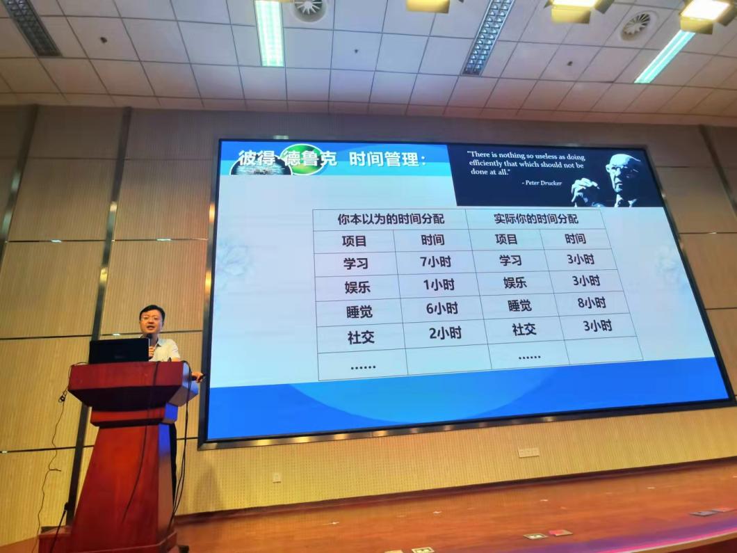 课上,李在宝围绕上大学想收获什么、时间是什么、怎么做好时间管理、如何看待人际关系等方面以师生问答等方式与同学们展开交流,结合学院历年来推荐免试攻读硕士研究生情况、学业预警、奖惩等情况,以大量的数据和实例列举了员工在时间管理方面的认识误区和行为偏差,以“一年365天,有多少时间可以用来学习?”、管理大师德鲁克的有关研究条分缕析引导同学们深入思考,清晰认识。针对新生易于困顿的学习与工作、学习与交际等方面深入交流“相信我,所谓的人脉就算重要,也根本没他们说的那么重要”,告诉同学们“ 承认自己能力有限,是心理健康的前提。”“要不怕在别人面前露怯;敢于不去证明自己是“好人;要去学习如何做事量力而行……””并真诚提出5点建议:1.专心做可以提升自己的事情;学习并拥有更多更好的技能;成为一个值得交往的人;2.学会独善其身,以不给他人制造麻烦为美德;用你的独立赢得尊重;3.除非有特殊原因,应该尽量回避那些连在物质生活上都不能独善其身的人;那些精神生活上都不能独善其身的,就更应该回避了——尽管甄别起来比较困难;4.真正关心一个朋友的意思是说,你情愿在他身上花费甚至浪费更多的时间;5.记住,一个人的幸福程度,往往取决于他多大程度上可以脱离对外部世界的依附。强调,学习是员工的天职,学习成绩是一切的基础,告诫同学们要摆正关系,明确目标,做好规划,祝愿新生同学们老员工活愉快充实。