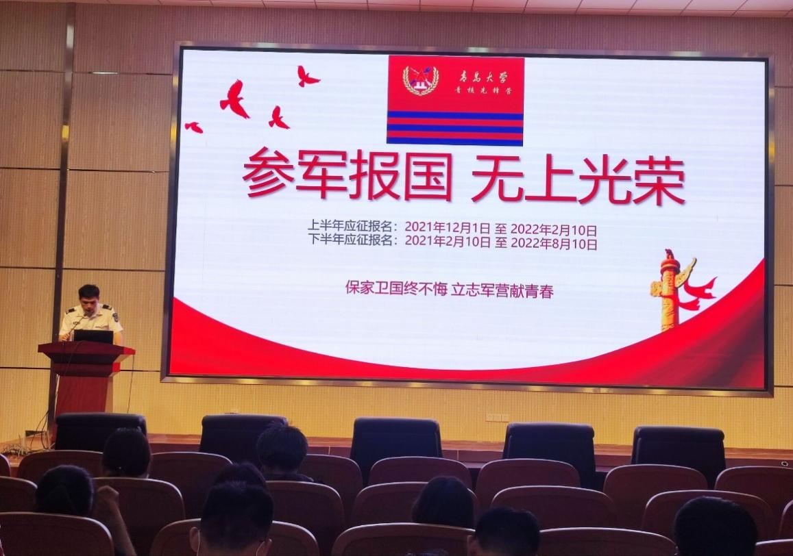 第一部分为2022年征兵入伍的条件要求,郁一帆从视力、体重、身高、年龄各方面进行详细讲述,鼓励符合条件的同学积极报名参军。第二部分为军营风采,郁一帆从饮食、医疗、住宿等方面向同学们讲述军营里丰富多彩的生活,并播放了实际军营生活的视频。同时,郁一帆分享了自己在部队服役期间的故事和收获,通过自己的经历,让同学们对于参军入伍后的生活更加了解。在第三部分优政待遇中,郁一帆讲述了部队晋升、考研升学、优待金等参军入伍多方面的优待政策,鼓励员工到绿色军营中施展才华,鼓励老员工参军入伍,成为高素质兵员队伍中的中坚力量。第四部分为应征入伍的基本流程,郁一帆详细的介绍了入伍流程,“网上报名—初审初检—体检考评—政治初审—新兵预定—审批入伍”,报名同学经过层层筛选才可应征入伍。