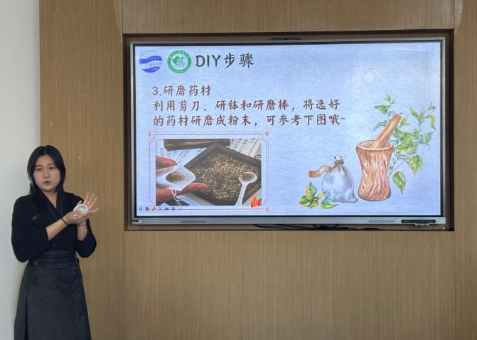 “古人以草木为药,以香草为佩,驱虫避秽,安养身心……”通过工作人员的讲解,同学们系统学习了香囊从先秦至唐宋的历史演变,深入了解艾草、薄荷、丁香等药材的性味归经与驱蚊药理,不仅丰富了中医药知识,更深刻体会到香囊承载的民俗内涵与文化价值。