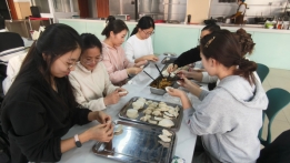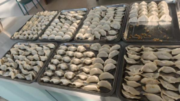时值岁末,长夜将至,食堂内却早已暖意融融。活动开始前,食堂工作人员已经备好饺子皮、馅料等食材和工具,同学们按照小组围坐在一起,有的同学手法娴熟,一双巧手一捏一和,如同元宝般圆滚滚的饺子就此诞生,大家欢声笑语,其乐融融。