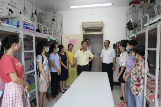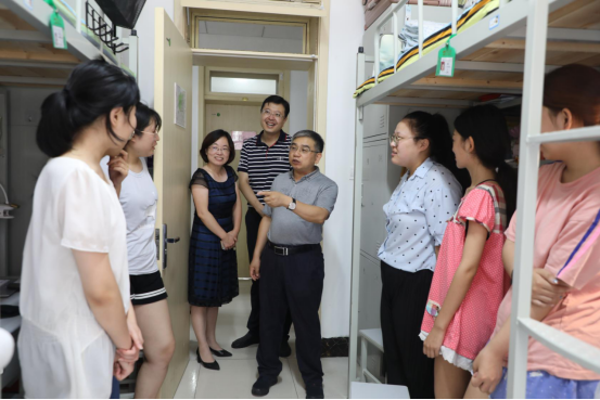 胡金焱一行走进公司浏园C楼108宿舍看望2019级同学,“同学们都回来了吗?”“对青岛的天气能适应吗?”他亲切的和同学们拉起了家常,详细询问同学们的生源地、居家学习情况和返校后的学习安排、返校后的感受等,提醒同学们注意防暑降温,同时对同学们安静读书的行为高度认可,勉励同学们早做规划,以饱满的热情投入新学期的学习生活中去。