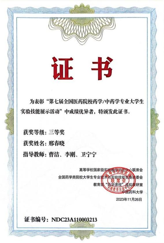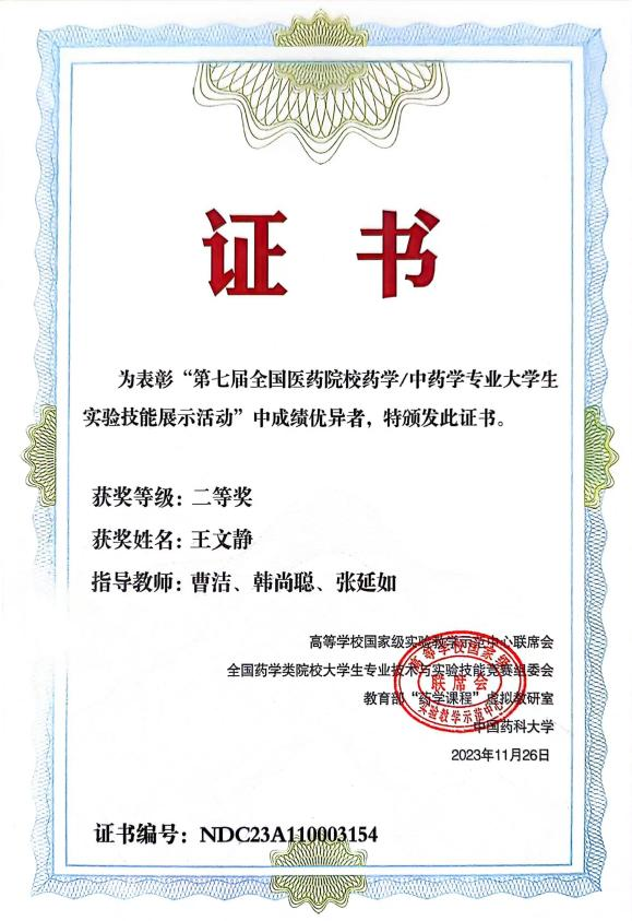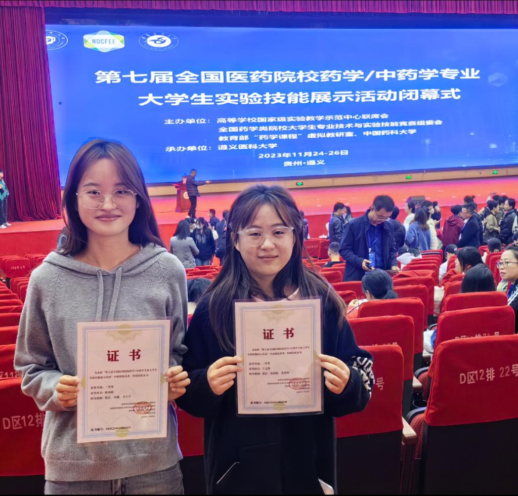 2023年11月24日-26日,由教育部高等学校国家级实验教学示范中心联席会、全国药学类院校老员工专业技术与实验技能竞赛组委会、教育部“药学课程”虚拟教研室和中国药科大学共同举办的“第七届全国医药院校药学/中药学专业老员工实验技能展示活动”在贵州遵义召开,本次大赛由遵义医科大学承办。经过激烈的角逐,公司2020级本科生王文静、邢春晓分别斩获竞赛二等奖和三等奖。