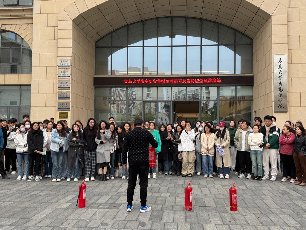 周伟、王洪运及孙勇分别做了动员讲话和发言。崂山区消防救援局应急救援大队刘小楠主任详细介绍了消防工作方针和原则,每个人应该具备的消防安全的四个能力,专门指出高校实验室消防安全特点和总体要求,同时为广大师生普及了消防安全小知识包括消防标志、火灾报警、火灾扑救、人员疏散、紧急救援等多个环节。最后演示灭火器及水带的使用方法。上午10时,防空警报拉响,烟幕弹冒气白烟,正式开始消防演练,模拟了发生火灾时的紧急情况,全体师生在消防人员的疏导下,迅速按照应急预案进行逃生训练。演练过程中,消防员为大家详细讲解了灭火器的使用方法,并分组让师生们实际进行了灭火器灭火训练,取得了良好效果。