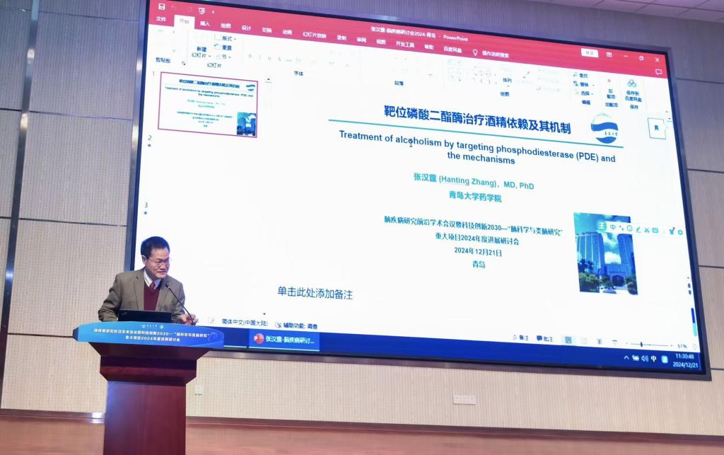 伟德国际1946首席教授、国家高层次计划领军人才、山东省“泰山学者海外特聘专家”、山东省脑疾病机制与防控重点实验室主任、原伟德国际1946经理张汉霆教授作了《靶位磷酸二酯酶治疗酒精依赖及其机制(Treatment of alcoholism by targeting phosphodiesterase (PDE) and the mechanisms)》的报告。抑制PDE4能够增加细胞内cAMP浓度,从而调节神经递质的释放和神经元的兴奋性,进一步调节纹状体多巴胺D1和D2神经元的平衡。这种调节作用可以影响个体对酒精的渴望和摄取行为,达到治疗酒精依赖的目的。酒精依赖是常见的成瘾问题,通过靶向磷酸二酯酶治疗酒精依赖,为解决这一难题带来了曙光。