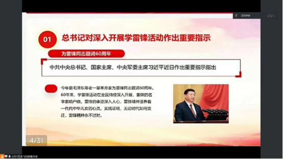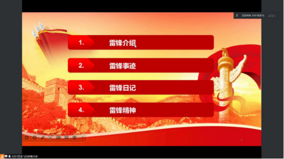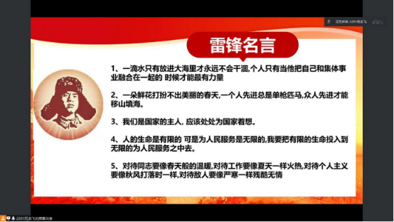 本次会议由四个方面展开,分别为雷锋介绍、雷锋事迹、雷锋日记、雷锋精神。首先,范龙飞同学介绍了习近平总书记对深入开展学习雷锋活动作出的重要指示,引导同学们学习助人为乐、全心全意为人民服务的伟大雷锋精神。其次,范龙飞同学向大家讲述了雷锋同志的光荣事迹,阐释了雷锋精神对青年员工的重要影响。最后,他向同学们展示了雷锋名言,鼓励同学们要学习雷锋品质,发扬雷锋精神。