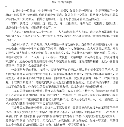 学习雷锋精神,让平凡的人生孕育出雷锋般的崇高精神,创造出明天的辉煌。希望同学们在今后生活中“对待他人要像春天一样温暖,对待学习像夏天一样火热,对待困难要像秋风扫落叶一样,对待不文明行为要像严冬一样残酷无情。”在雷锋精神的熏陶下,同学们能用雷锋精神鼓舞更多的人,做新时代雷锋精神的继承者与传播者!
