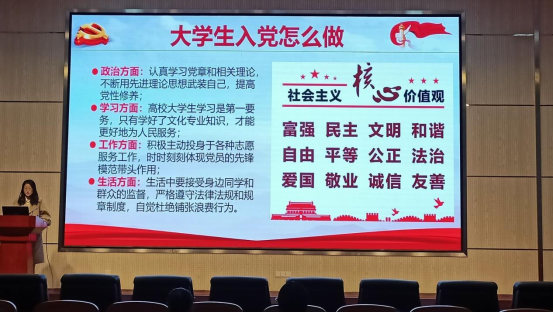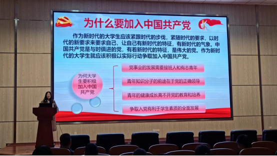 会上,王梦迪首先带领同学们一起学习了习近平总书记在庆祝中国共产党成立100周年大会上的讲话精神,向同学们介绍了党的基本知识,“为有牺牲多壮志,敢教日月换新天。”“一百年前,一群新青年高举马克思主义思想火炬,在风雨如晦的中国苦苦探寻民族复兴的前途。一百年来,在中国共产党的旗帜下,一代代中国青年把青春奋斗融入党和人民事业,成为实现中华民族伟大复兴的先锋力量。新时代的中国青年要以实现中华民族伟大复兴为己任,增强做中国人的志气、骨气、底气,不负时代,不负韶华,不负党和人民的殷切期望!”鼓励同学们加强学习,积极向党组织靠拢,以实际行动践行新时代责任担当。随后,王梦迪向同学们介绍了伟德国际1946员工党支部的组成情况,详细解读了入党条件、入党程序和入党申请书具体要求。