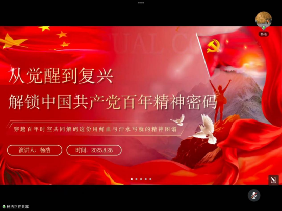 随后,杨浩同志以《从觉醒到复兴:解锁中国共产党百年精神密码》为题展开分享。他以中国共产党百年历程为时间轴,剖析了不同历史阶段中国共产党人凝聚形成的伟大精神,通过梳理这些精神脉络,深入浅出地解读了中国共产党百年征程中的精神密码。杨浩同志引导员工党员赓续红色精神血脉,保持更加昂扬向上的精神状态,牢记初心使命,坚定理想信念,践行党的宗旨,不断为强国建设、民族复兴伟业添砖加瓦、增光添彩。